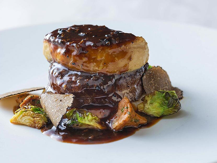肉类料理“黑毛和牛里脊肉和鹅肝的罗西尼酱汁培根”、