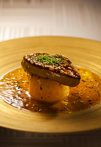 从酒店开业之初就没有变化的人气菜品。用煎鹅肝和高汤炖煮的萝卜,搭配鸭肉汤和黄油、黑胡椒提味的浓厚酱汁。在佐料中加入酱油等,既有法式风味又融入了日式风格,是一款吃过一次就不会忘记的极具冲击力的珍品。