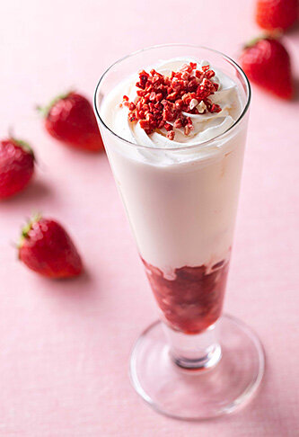 混合了草莓果肉和牛奶、鲜奶油和冷冻干燥的草莓粒,是一杯清爽的甜味。根据混合情况,也可以享受味道和口感的变化。